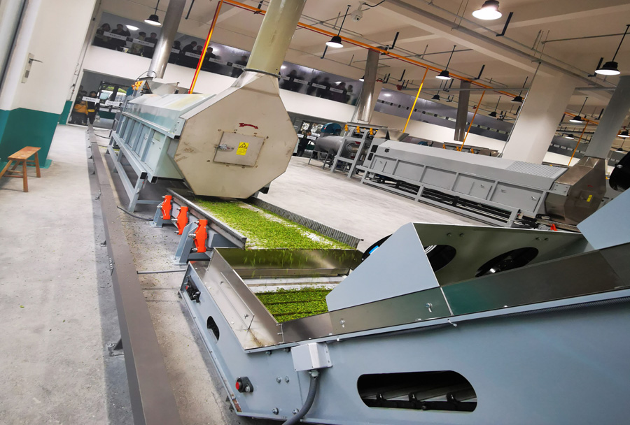 機(jī)組組成:本機(jī)組由鮮葉輸送機(jī)、超高溫?zé)犸L(fēng)茶葉滾筒殺青機(jī)、冷卻輸送機(jī)、機(jī)組集成控制系統(tǒng)組成。