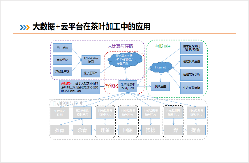 控制系統(tǒng)通過對(duì)茶葉加工生產(chǎn)線數(shù)字化管理與數(shù)據(jù)處理技術(shù)的研究,進(jìn)一步提升茶葉加工生產(chǎn)線的數(shù)字化管理水平,并通過加工品質(zhì)在線監(jiān)測與反饋實(shí)現(xiàn)一葉一策的加工模式,通過加工大數(shù)據(jù)的處理與分析為工藝優(yōu)化與設(shè)備改進(jìn)提供支撐。